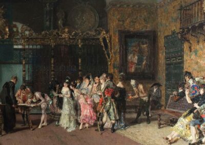 Marià Fortuny i Marsal, souvent simplement désigné sous le nom de Fortuny, est un peintre catalan né le 11 juin 1838 à Reus en Catalogne et mort prématurément le 21 novembre 1874 à Rome. Considéré comme l’un des artistes les plus éminents du XIXe siècle en Espagne, il a profondément marqué la scène artistique européenne de son époque. Fortuny a débuté sa formation artistique dès son jeune âge, révélant un talent exceptionnel qui l’a conduit à étudier à Barcelone. Il a ensuite continué ses études en Italie, où une bourse, attribuée en reconnaissance de ses compétences par les autorités de sa région natale, lui a permis de s’imprégner du riche patrimoine artistique tout en développant son propre style distinctif. L’œuvre de Fortuny est variée, abordant des thèmes orientalistes, des paysages, des scènes historiques ainsi que des portraits. Son style se distingue par une attention minutieuse aux détails, une maîtrise remarquable de la lumière et une palette de couleurs éclatante. Par ailleurs, ses réalisations les plus célèbres incluent « La Vicaria » (Le Mariage), « La Bataille de Tétouan » et plusieurs études sur la vie quotidienne au Maroc. Fortuny est également renommé pour son expertise en aquarelle, technique qui lui a permis d’atteindre une expressivité et une finesse rarement égalées. Bien que sa carrière ait été tragiquement écourtée par son décès à seulement 36 ans, son influence demeure palpable à travers ses œuvres et les nombreux artistes qu’il a inspirés. Suite à sa mort, certaines œuvres inachevées ont été complétées par d’autres artistes, tandis que d’autres sont restées intactes, témoignant du processus créatif unique de Fortuny. Il est aujourd’hui célébré comme l’un des maîtres du XIXe siècle, dont l’héritage continue d’enrichir le monde des arts visuels.