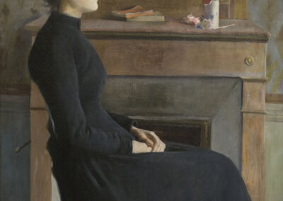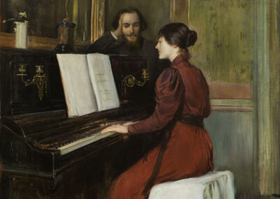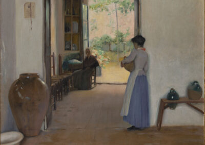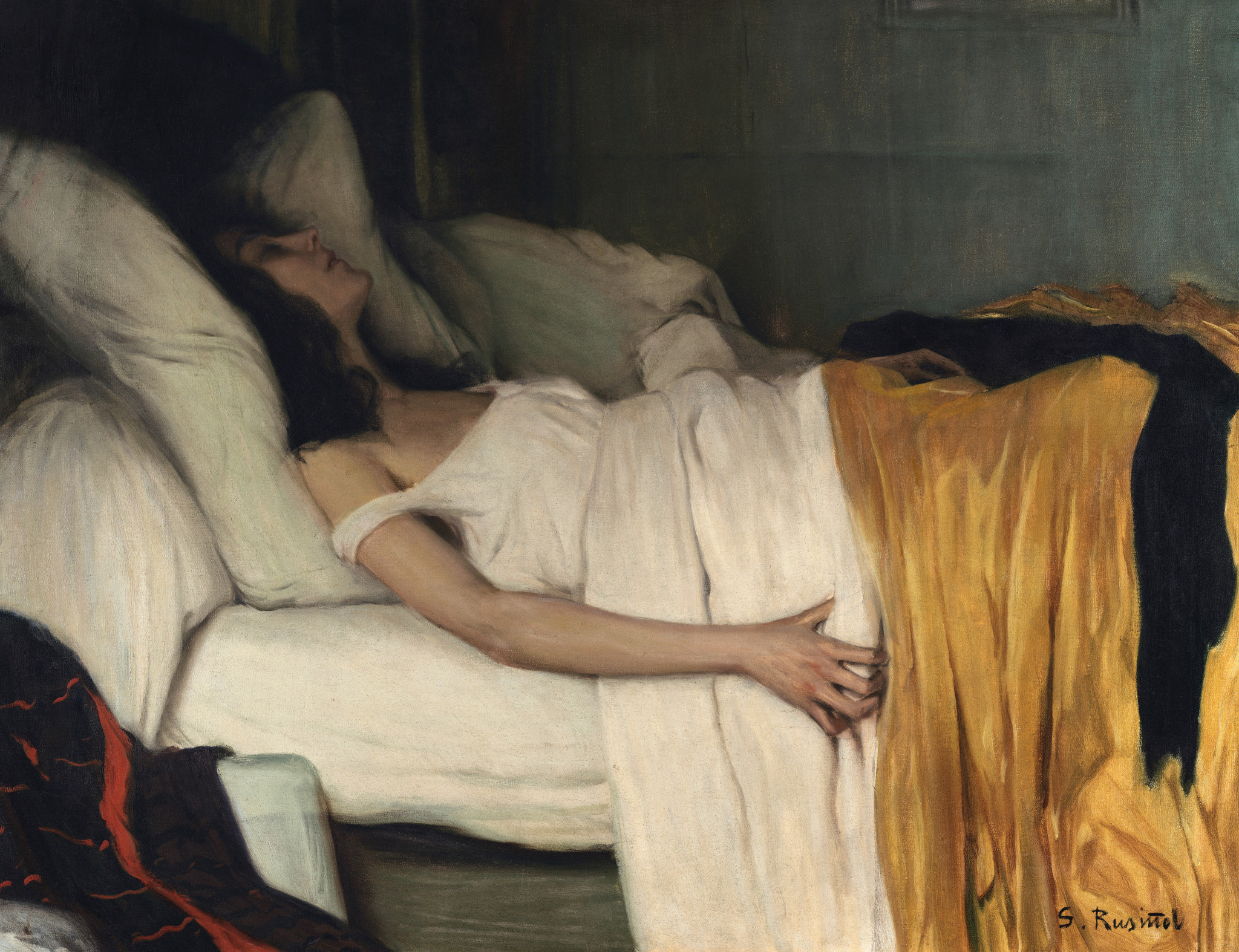 Ses premières œuvres, marquées par l’influence de Carrière, Whistler et l’estampe japonaise, illustrent des scènes intimistes et réalistes, avec des représentations délicates de portraits en plein air et des intérieurs de jeunes femmes ou d’enfants. Au fil du temps, Rusiñol s’oriente vers un symbolisme teinté de sentimentalisme, en écho à la tradition préraphaélite. Après son retour à Barcelone en 1894, il devient une figure incontournable du milieu artistique par le biais de son affiche, de ses décorations et de ses peintures et cofonde les Quatre Gats, un lieu de rassemblement pour les avant-gardistes qui rappelle le Chat-Noir.